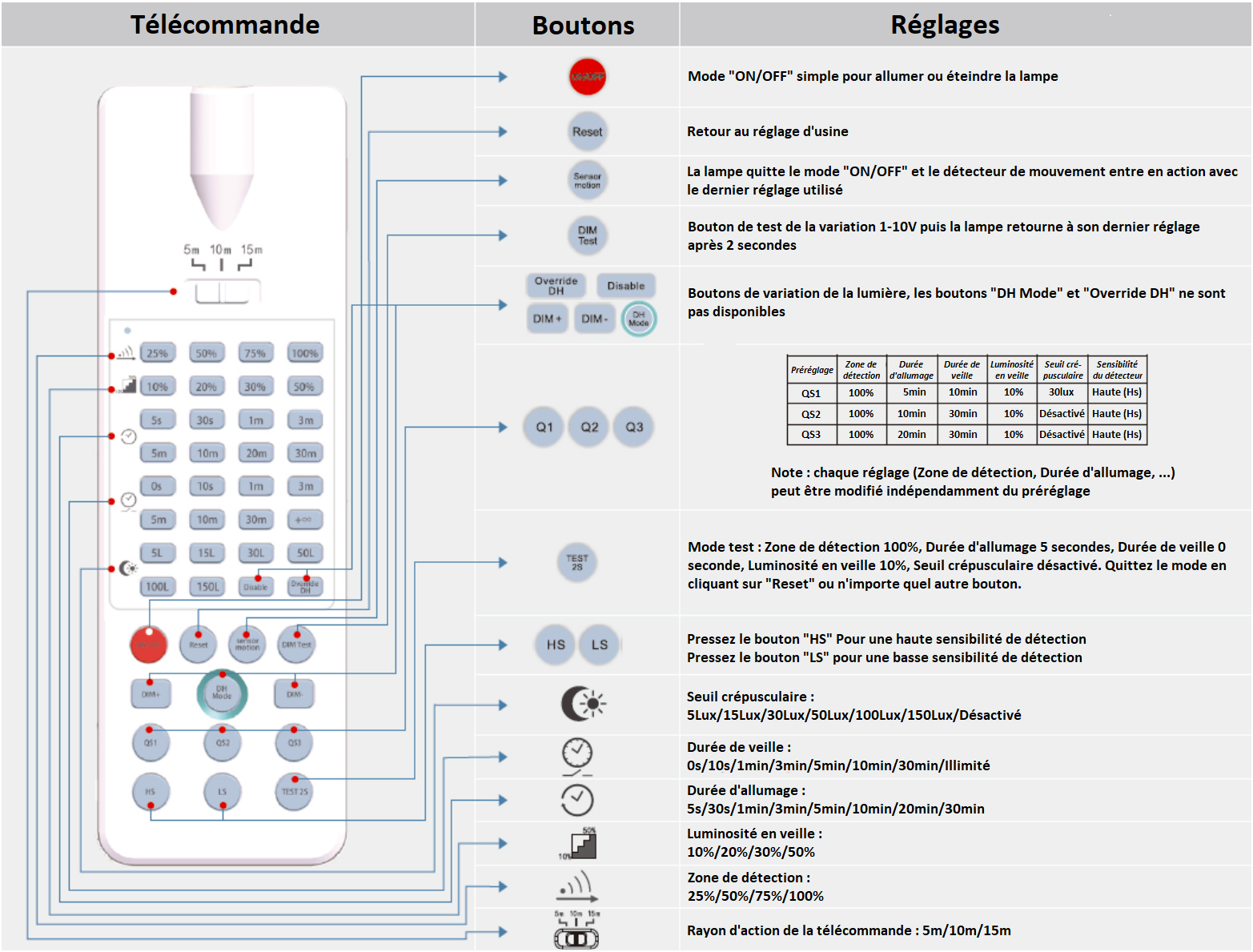 Découvrez ci-dessous la notice de cette télécommande qui vous permettra de régler vos suspensions industrielles LED Stock Premium dotés de modules de détection de mouvement BSS ainsi que les projecteurs Place en version "BSS".