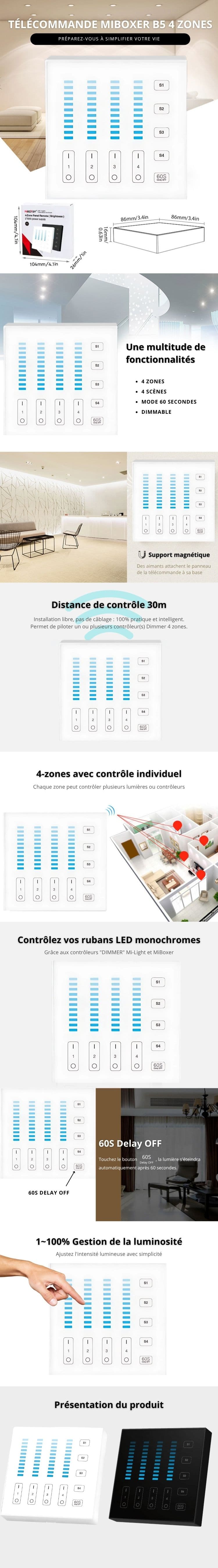 La télécommande murale MiBoxer B5 permet de contrôler votre éclairage sans câblage ni perçage, jusqu’à 30 mètres de distance. Fixée sur son support magnétique, elle fonctionne comme un interrupteur mural et se détache facilement pour un usage en télécommande portable. Grâce à ses 4 zones, elle offre un contrôle souple et précis des éclairages monochromes ou à température de couleur variable (CCT).
