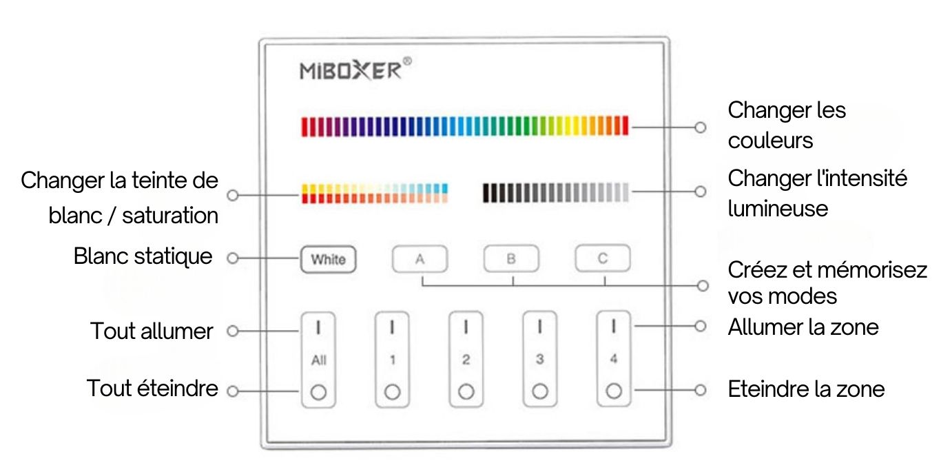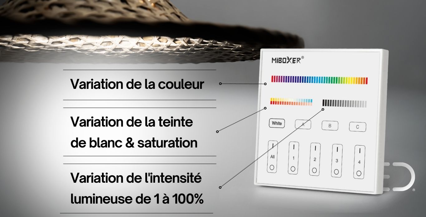 | Pour couleurs de ruban | 5 couleurs (RGB+CCT) |