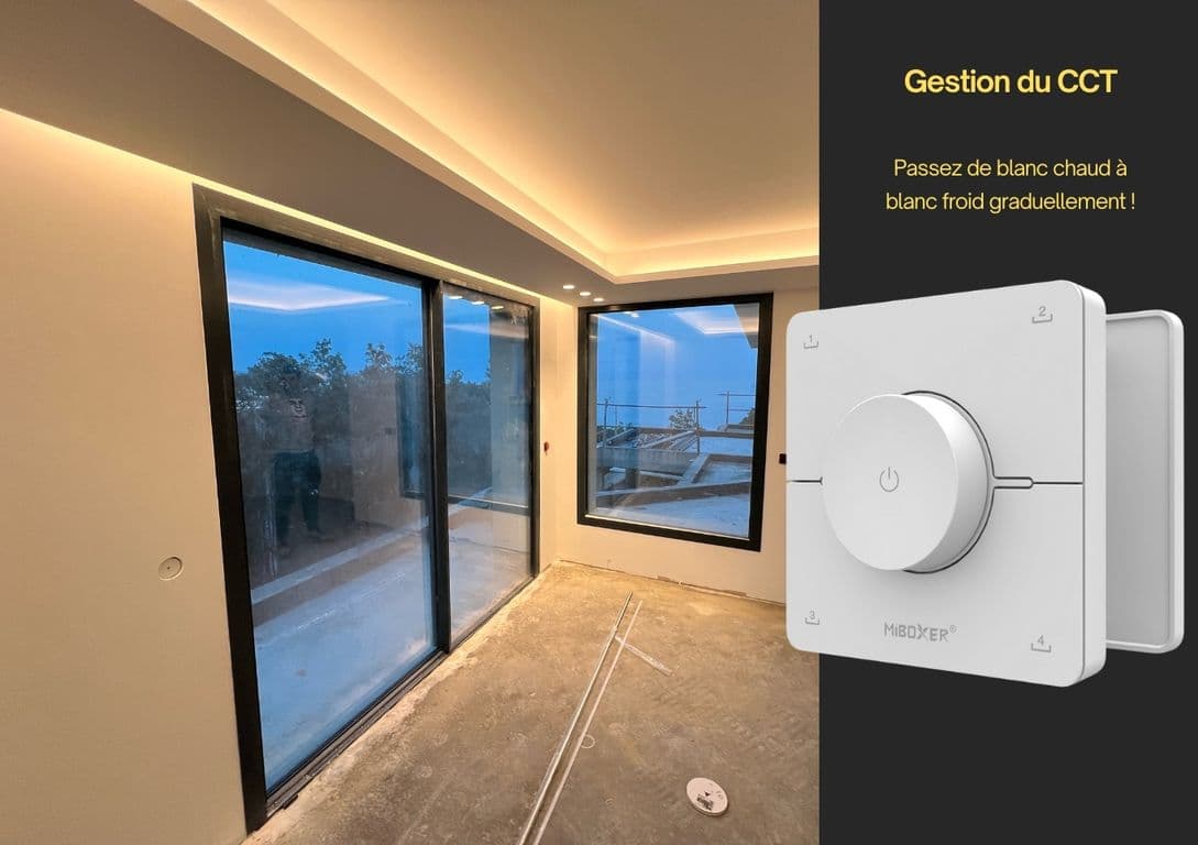 Grace à la fonction CCT, vous pouvez modifier la température de couleur des rubans "CCT", c'est à dire passer rapidement d'un éclairage blanc chaud à blanc pur en passant par le blanc jour. Pour basculer au mode CCT, il suffit d'appuyer 5 secondes sur le bouton ON-OFF, puis de tourner le bouton ON-OFF (l'appareil se déconnectera du mode CCT pour revenir au mode dimmer si l'utilisateur ne l'utilise pas dans les 3 secondes).