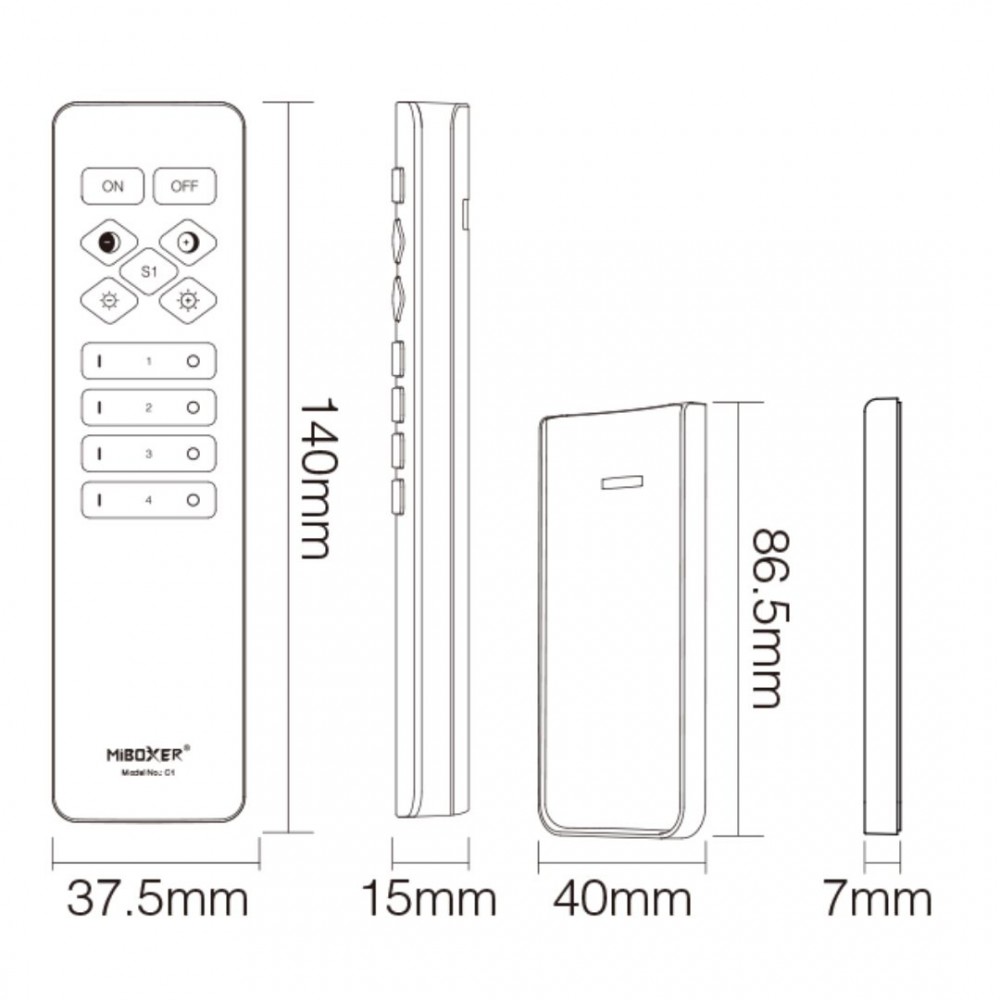 La télécommande C1 est compatible avec toute la gamme de contrôleurs MiBoxer et fonctionne avec 2 piles AAA (non fournies, disponibles en cliquant ici).
