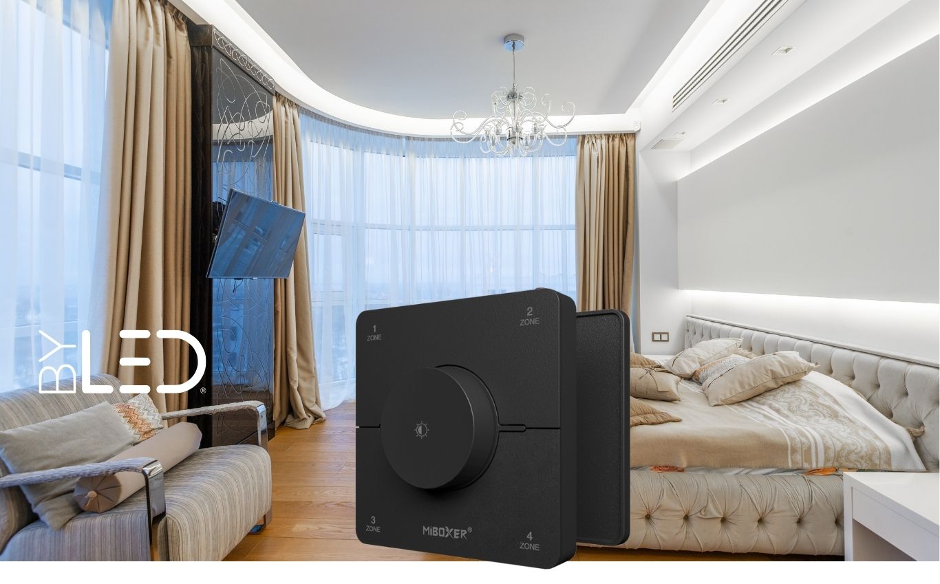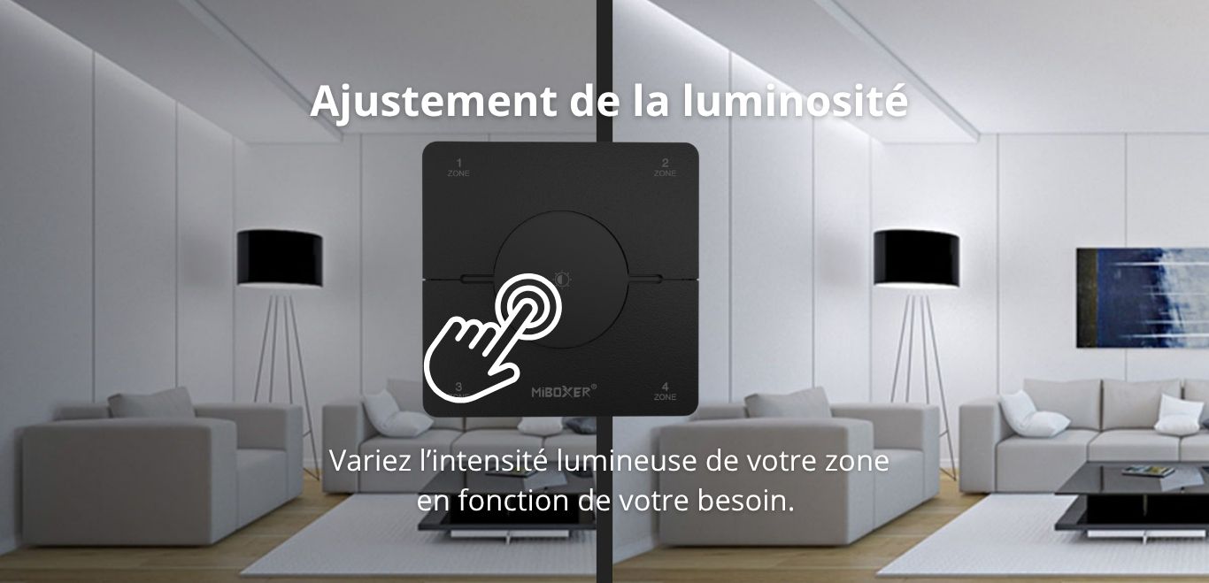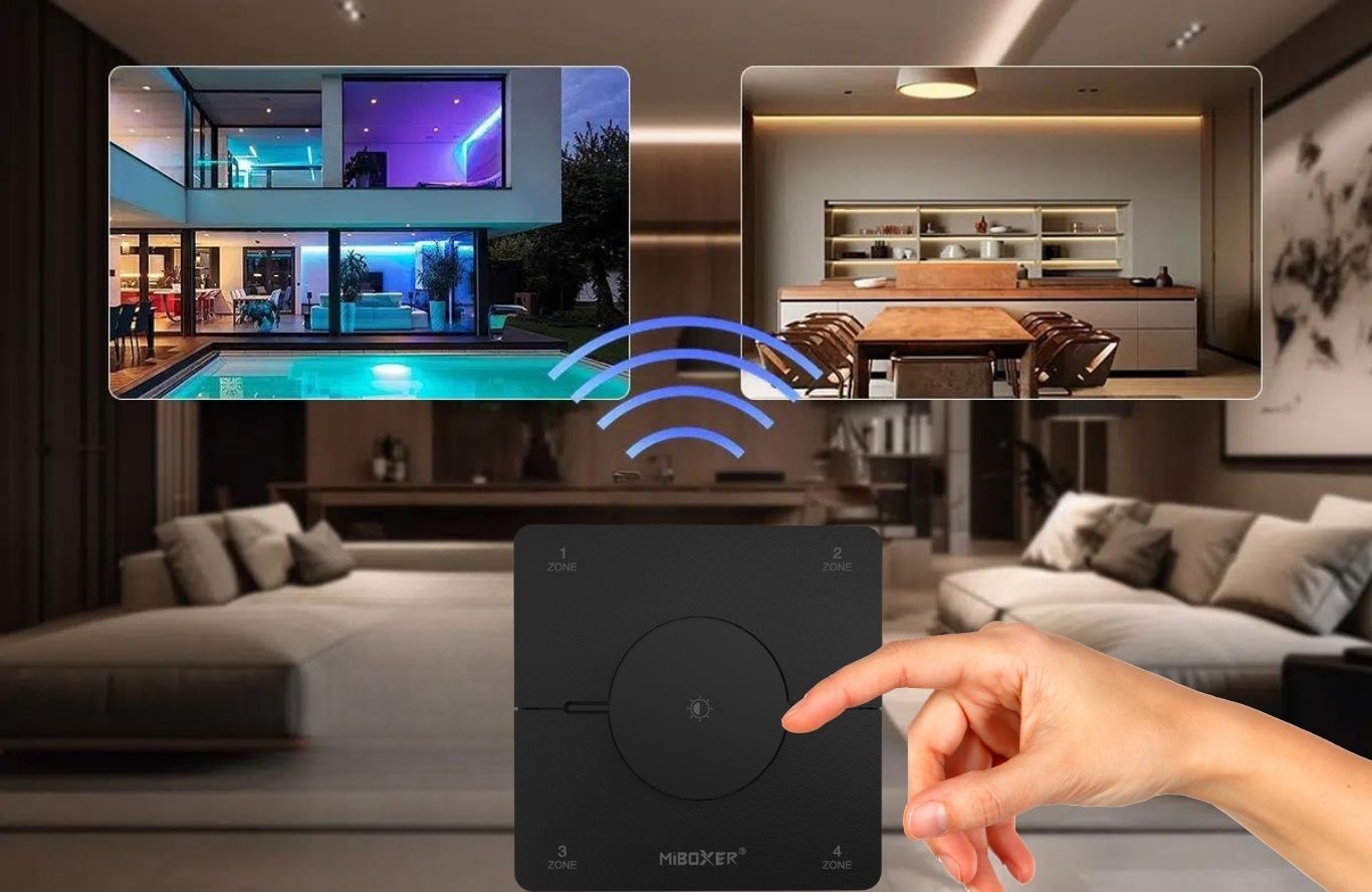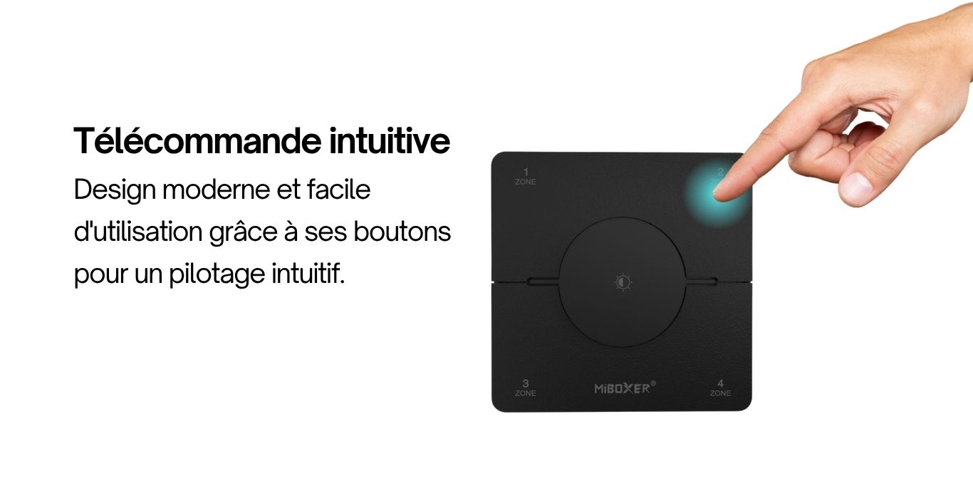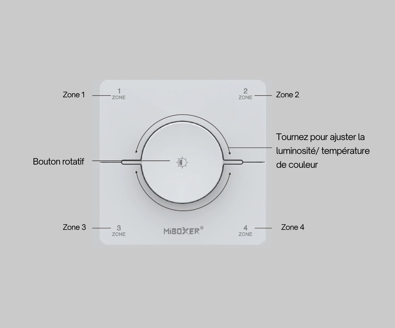 La télécommande MiBoxer K0S permet de piloter jusqu’à 4 zones d’éclairage de manière indépendante ou groupée. Vous pouvez ainsi contrôler chaque zone séparément pour créer des ambiances variées dans votre espace, ou synchroniser l’ensemble de vos éclairages selon vos besoins. D’un simple geste, adaptez votre éclairage pièce par pièce ou sur l’ensemble de votre installation.