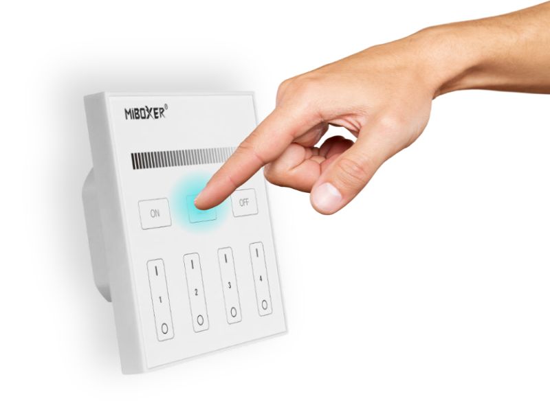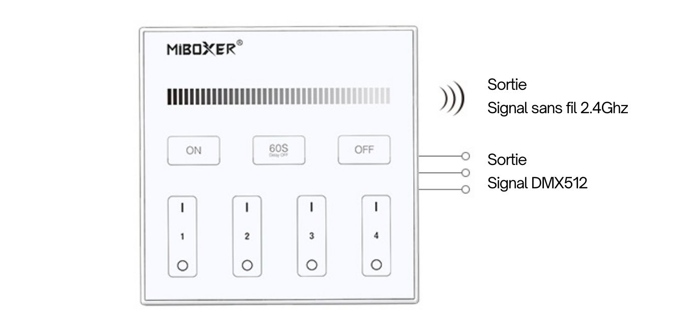 Une fois votre télécommande murale MiBoxer X1 branchée à votre contrôleur DMX512 en filaire, vous pouvez également utiliser la fonction sans fil 2.4Ghz : votre télécommande murale MiBoxer X1 peut être associé avec les autres télécommandes sans fil de la gamme MiBoxer afin de piloter votre circuit DMX512 en sans fil !
