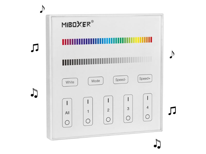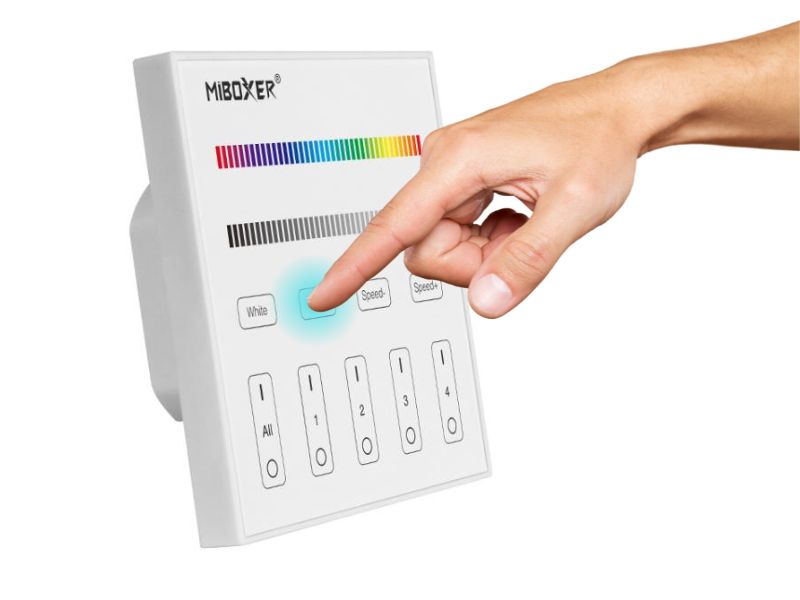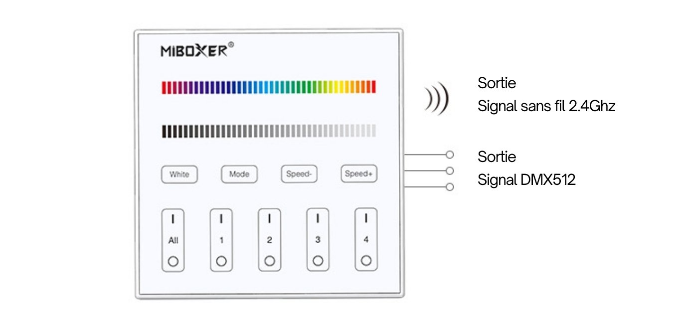Une fois votre télécommande murale MiBoxer X4 branchée à votre contrôleur DMX512 en filaire, vous pouvez également utiliser la fonction sans fil 2.4Ghz : votre télécommande murale MiBoxer X4 peut être associé avec les autres télécommandes sans fil de la gamme MiBoxer afin de piloter votre circuit DMX512 en sans fil !