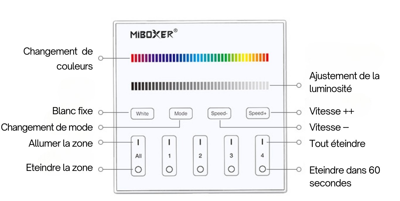 Cette télécommande 4 zones pour ruban LED RGB+W vous permet de varier l'intensité lumineuse de 0 à 100% et le blanc ou la couleur de votre lumière.