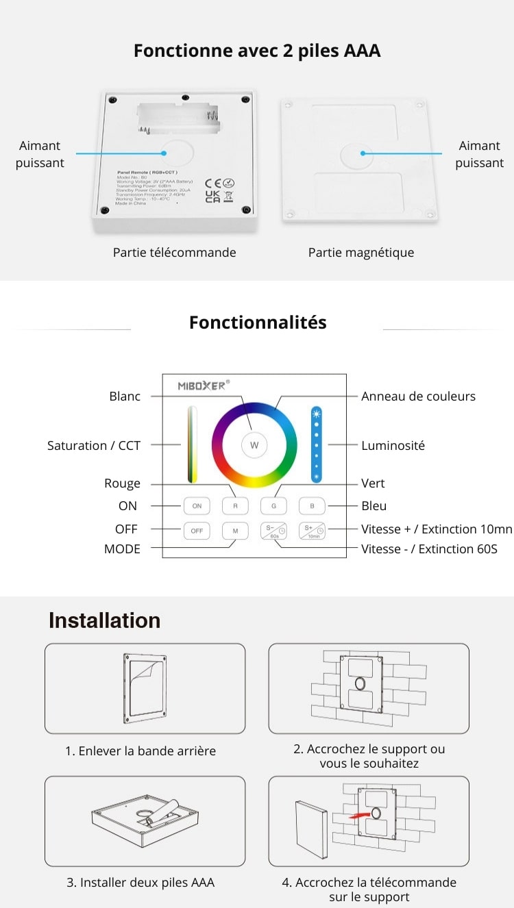 Retrouvez dans la galerie photo le schéma de la télécommande MiBoxer B0, montrant l’emplacement de ses différents boutons. Leurs fonctions sont expliquées ci-dessous et détaillées dans la notice (voir onglet Téléchargement).