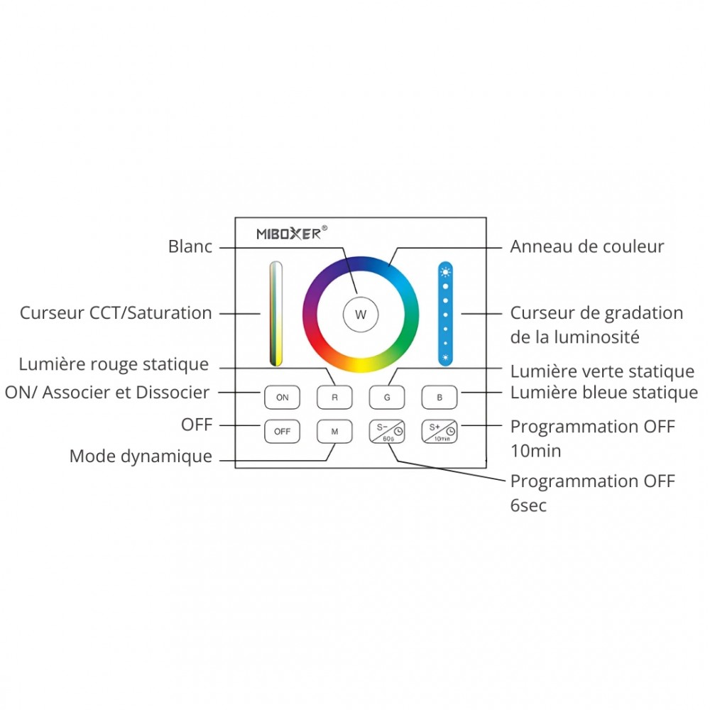 Retrouvez dans la galerie photo le schéma de la télécommande MiBoxer B0, montrant l’emplacement de ses différents boutons. Leurs fonctions sont expliquées ci-dessous et détaillées dans la notice (voir onglet Téléchargement).