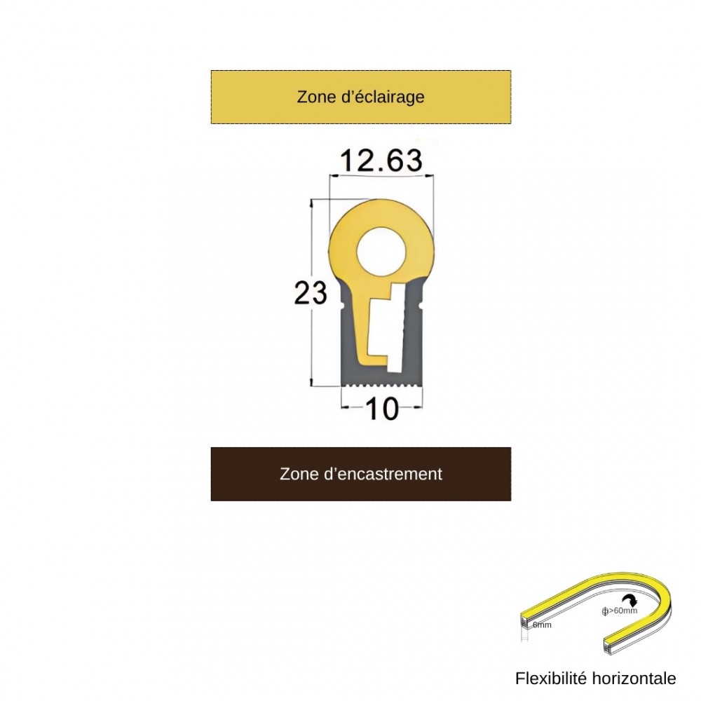 Ce tube néon flex 10x23 mm est conçu pour diffuser la lumière de manière latérale. Le ruban LED s’insère sur le côté à l’intérieur du tube, orientant la lumière vers les parois internes avant qu’elle ne soit projetée vers le haut. Cette conception assure un éclairage doux et agréable à l’œil.
